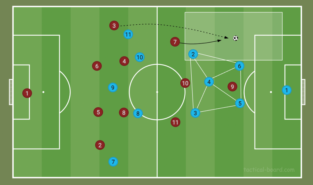 The positioning of Walker and Cancelo, in relation to the centre-backs and Rodri, provided excellent cover against both wide and central counter-attacks from West Ham. They formed a compact unit capable of shifting horizontally, and each player had a separate section of the pitch they were responsible for if a West Ham attack was to progress. Starting centrally with the option to cover wide areas proved more effective than vice versa, as it instantly eliminated the half-space as an attacking route for West ham, forcing them wide.