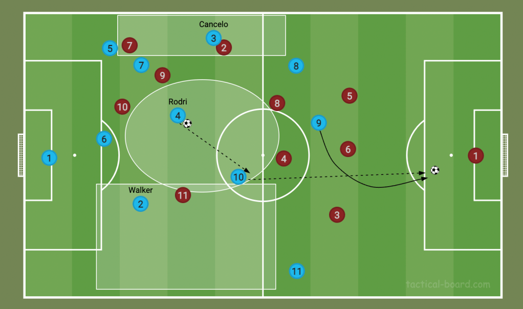 What is most impressive is that by the time West Ham had figured out the roles of Walker and Cancelo in City’s build-up, Guardiola had a second approach ready to implement. The full-backs began to spread in the first phase, more conventionally, as the game wore on. This forced those committed to West Ham’s press to spread and cover the pitch. However, vacating the central area left Rodri with acres of space to receive the ball, turn, and spray a pass out wide further up the pitch. Haaland bent his run, and De Bruyne found him with a pinpoint pass. This is how City managed to cut through West Ham’s midfield and defence for the second goal. Walker and Cancelo’s wide positioning attracted West Ham’s wingers, leaving Rodri with the entirety of the central zone to himself, as seen below.