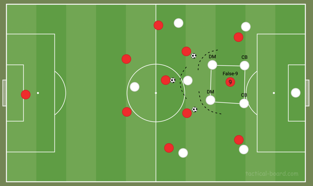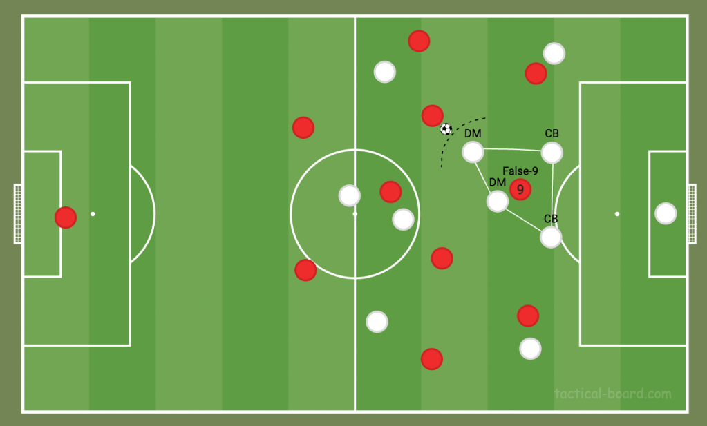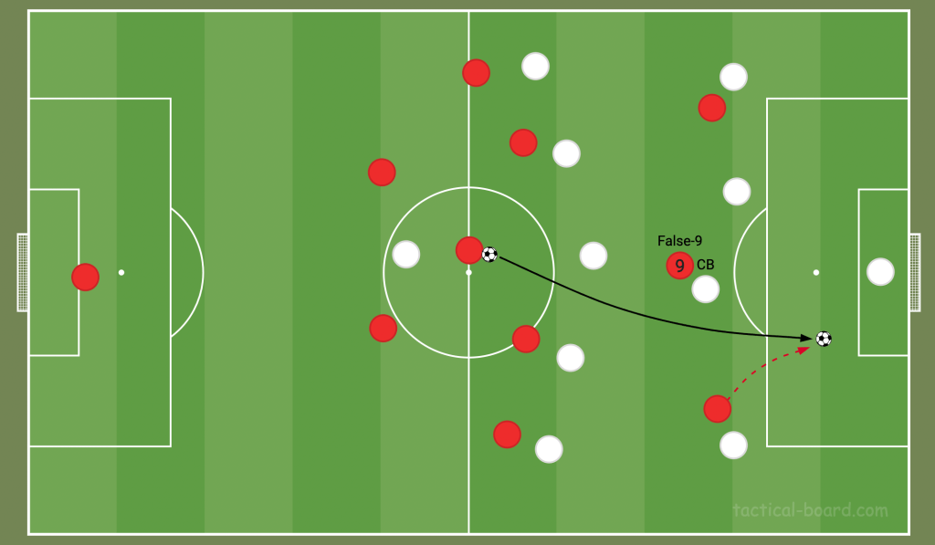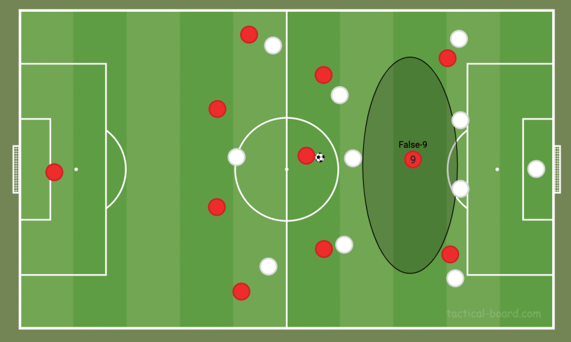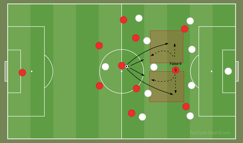False-9s start in disguise as a true striker, but drop in to offer a 4v3 overload in midfield build-up, drifting between the lines.