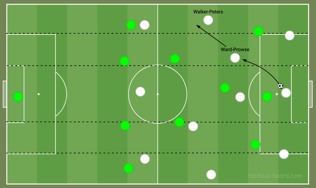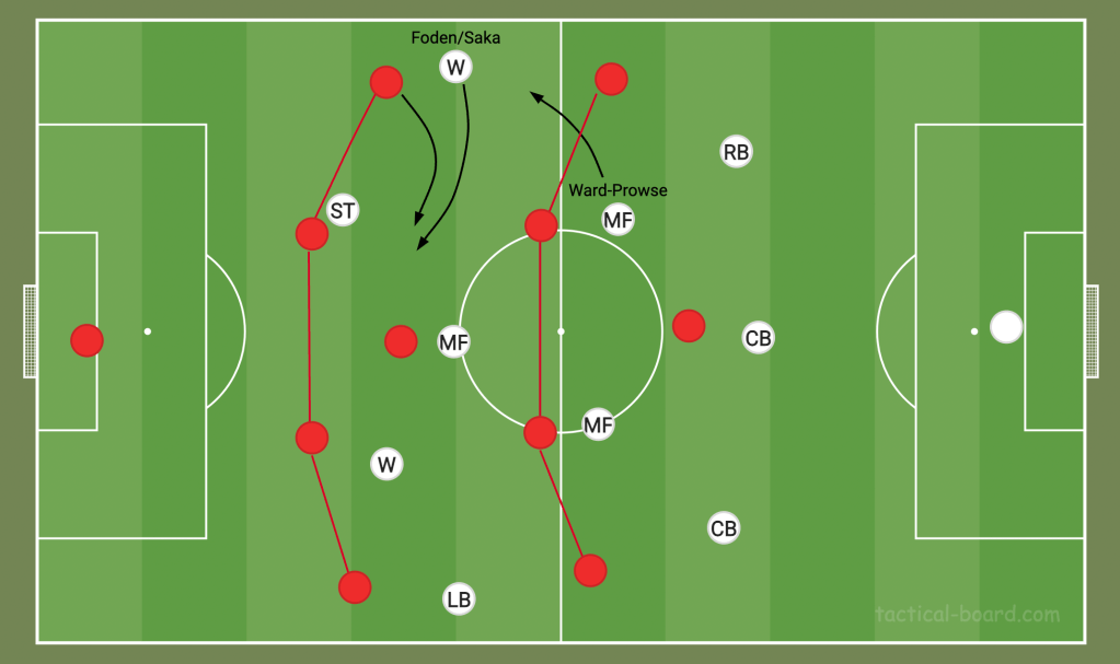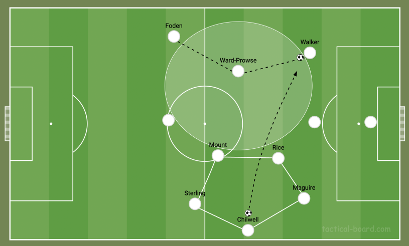Therefore, when the ball gets switched from the left to the right side, only one of England’s midfielders is ever an option to receive. The advantage of this player being Ward-Prowse as opposed to another squad member (such as Kalvin Phillips) is that he is comfortable drifting wide to link the play from right-back to right-wing. When Ward-Prowse has offered himself in this kind of area before, his team have been able to launch a quicker and more direct attack.