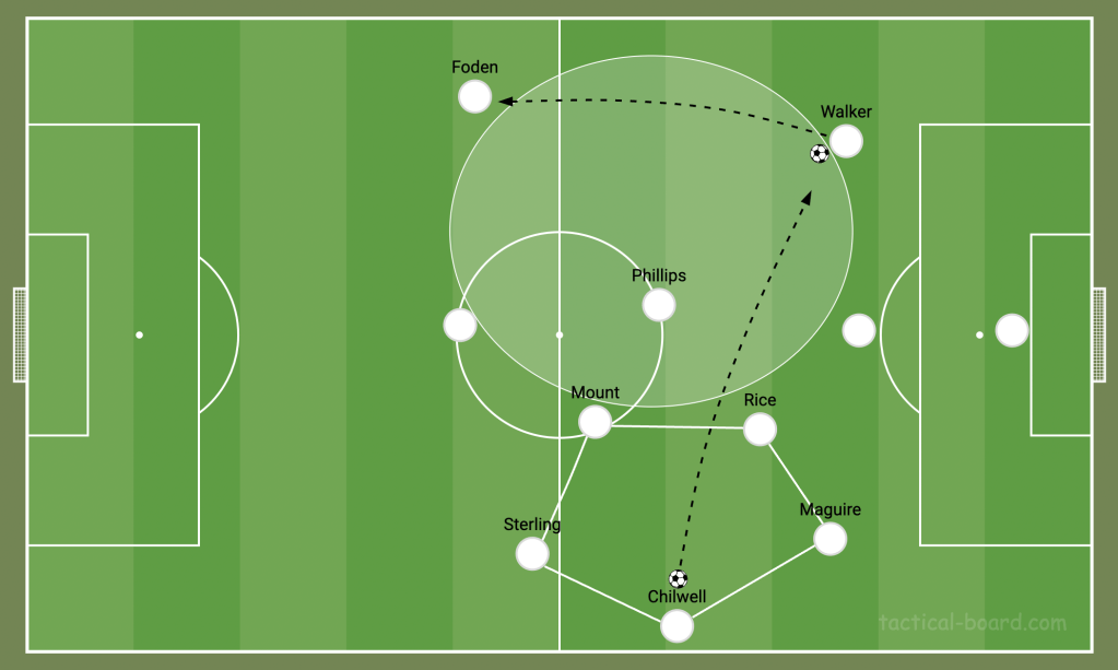 During the Euros, Phillips wasn’t particularly well-drilled in making this movement instinctively (as seen below), and Kyle Walker was often forced into attempting a speculative pass to Phil Foden.