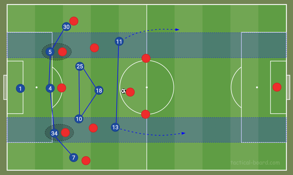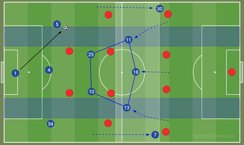 During the first phase described above, the front three cover the width of the pitch and pin the opposing defence back deep in their own half. They do this to create a large gap between them and the midfield.