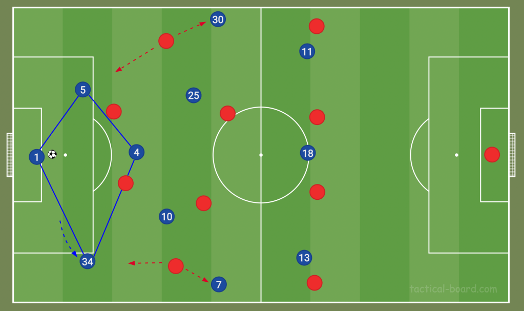 It is a recurring move which has frequently resulted in an overload, with five players committed to beating the high press. Manchester United and Leicester City in particular struggled to deal with these movements when they pressed aggressively.