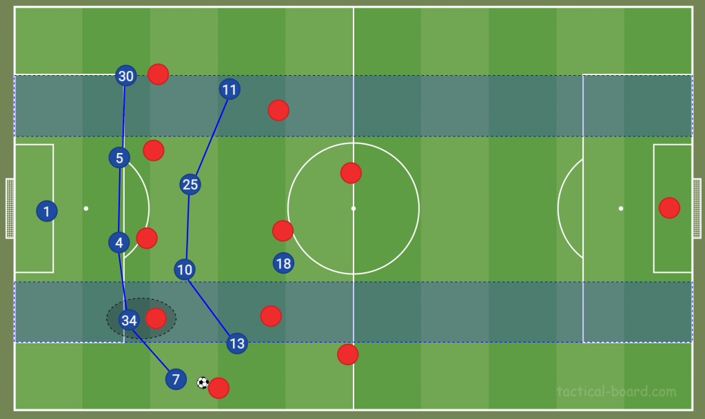 However, Brighton’s ability to play out from the back and bypass a press is one of the finest in the Premier League. Robert Sánchez in goal is impressive with his feet, which adds an extra man to the first phase of build-up. On top of this, we have seen right-centre-back Joël Veltman stretch the play horizontally by pushing towards the touchline. This creates gaps in the middle if the opposition spreads to track Veltman, and triggers the movement of one of the central midfielders towards the play (often Alexis Mac Allister) as an option in the right-half-space.