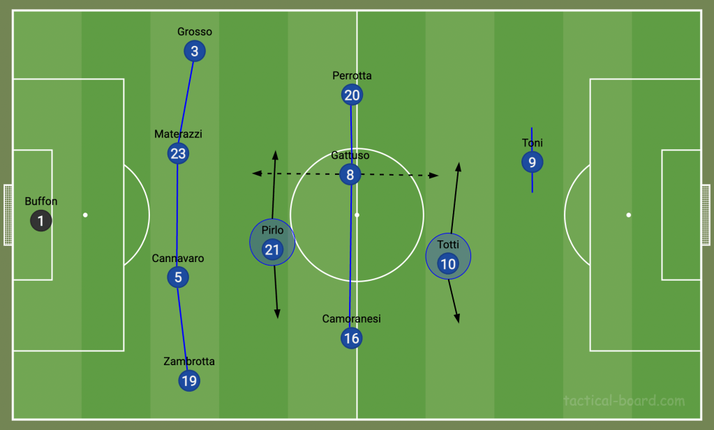 Used functionally, Perrotta and Camoranesi would spend most of their time serving the requirements of Pirlo. Since the AC Milan man was arguably Italy’s most important player on the ball, opposition teams began to target him as a player to man-mark out of the game, preventing him from receiving the ball or moving it on to a teammate.