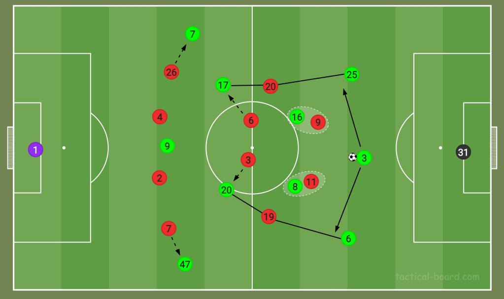The purpose of both of these transitions was to apply pressure to Man City’s wide centre-backs, and block passes into the middle of the pitch — where Guardiola’s team prefers to play.