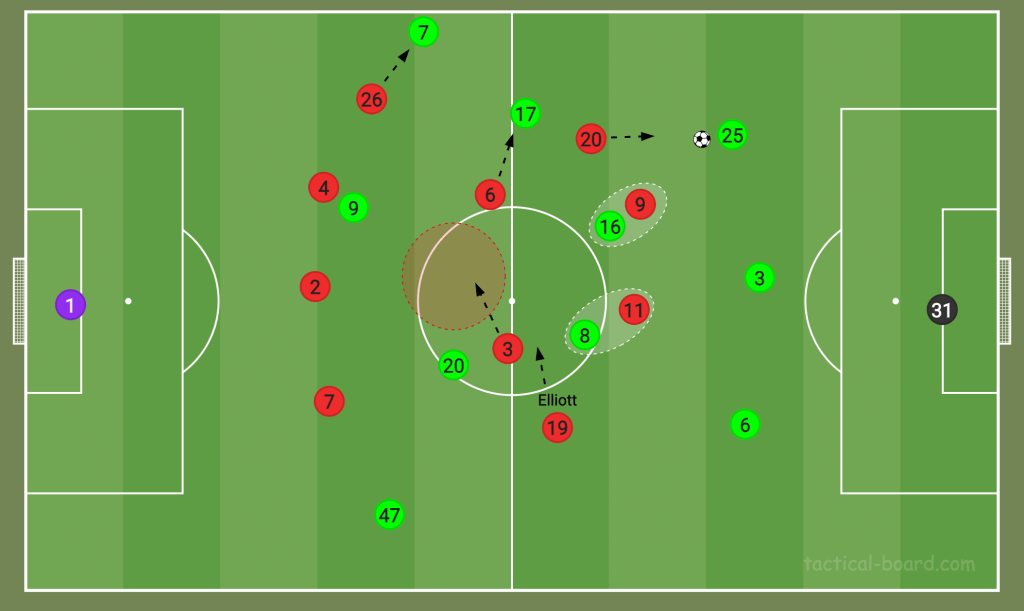 When the ball was played to right-centre-back Manuel Akanji, Liverpool would transition into more of a 4-3-3, their favoured shape. The key player in this transition was Elliot, who would drop in from right-wing to centre-midfield, leaving Firmino and Salah to block central passes (just as before), and Jota to press Akanji.