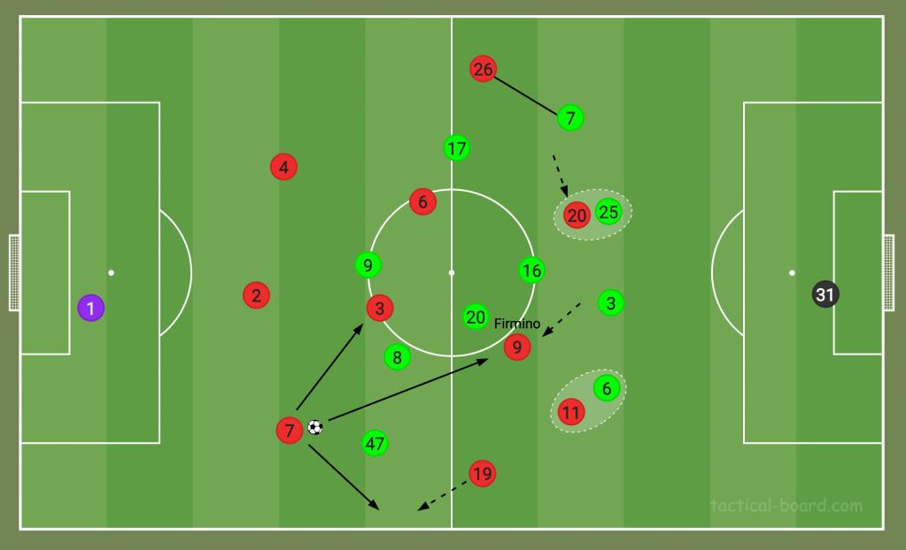 On the left side, Jota and Firmino would take it in turns making a third-man run into midfield to help create numerical superiority, and, on occasion, would both drop in together — creating a box through which they could dominate the midfield.