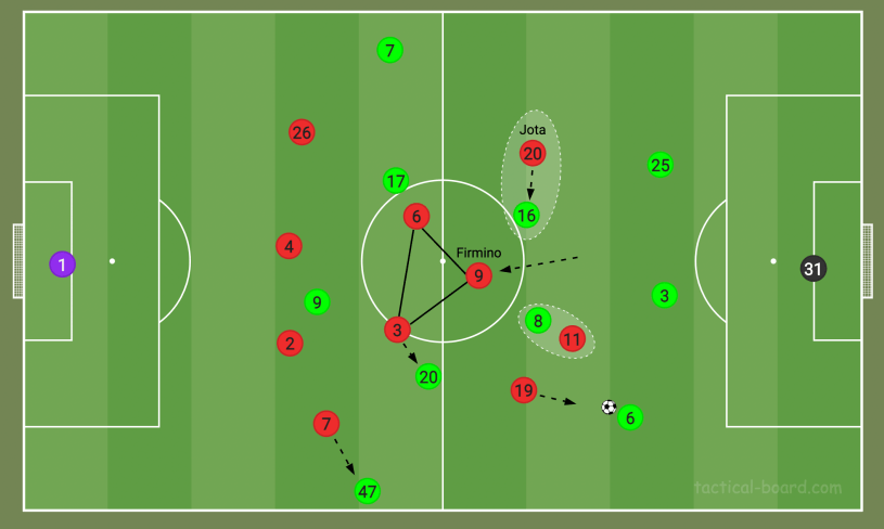 On the left side, Jota and Firmino would take it in turns making a third-man run into midfield to help create numerical superiority, and, on occasion, would both drop in together — creating a box through which they could dominate the midfield.