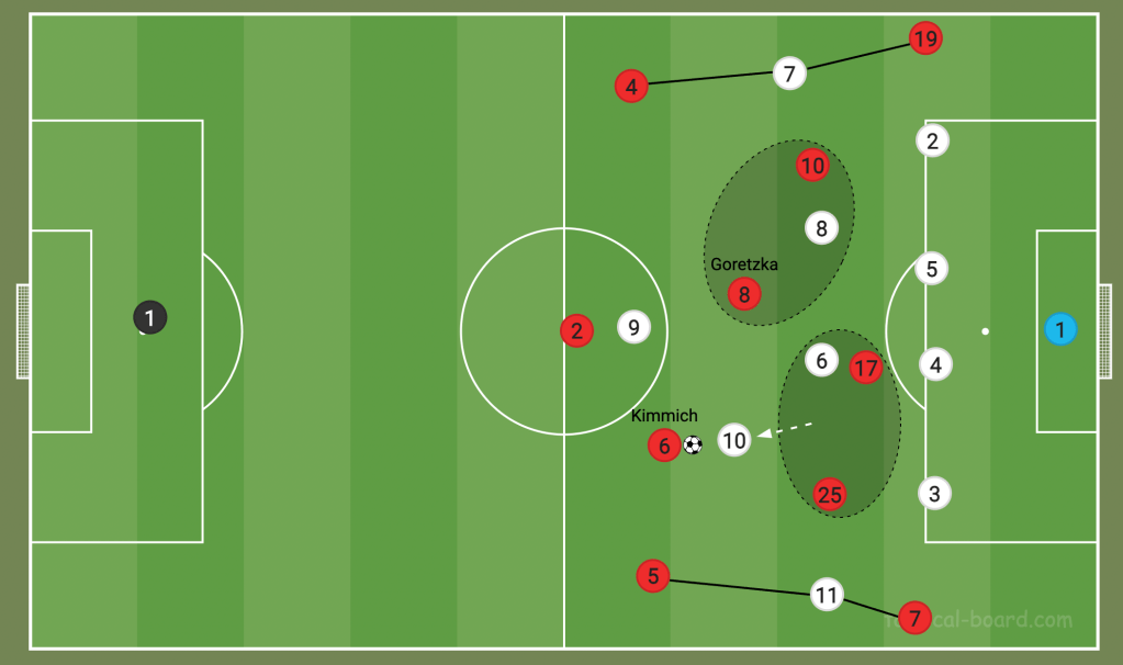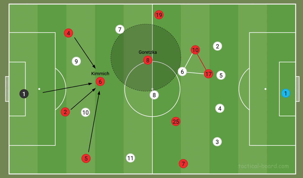 When either Kimmich or Goretzka has the ball in this phase, they draw the press of one midfielder, leaving the other two to deal with four Bayern players, as seen above.