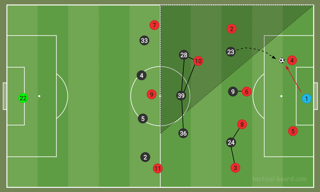 Like in a chess match, Howe’s game plan is based around always looking multiple moves ahead. Creating overloads not only increases their chances of scoring a goal, but also fits their defensive principles for if they lose the ball during an attack. The Gegenpress mentioned earlier requires Newcastle to have a lot of players near and around the ball when possession is lost. The success of Newcastle’s Gegenpress has been particularly tangible this season, with many of their goals coming directly from turnovers of possession high up the pitch.