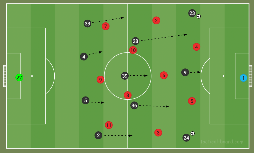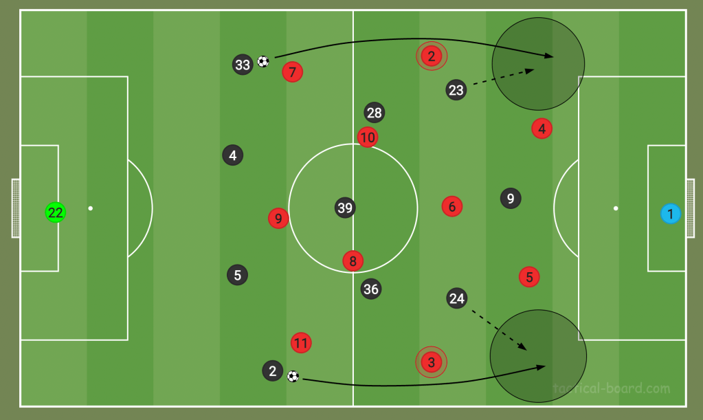 From here, they have sometimes used the full-backs to cross into the box, and other times the wingers have held the ball up, waiting for support in the final third, then dribbled into the box themselves.