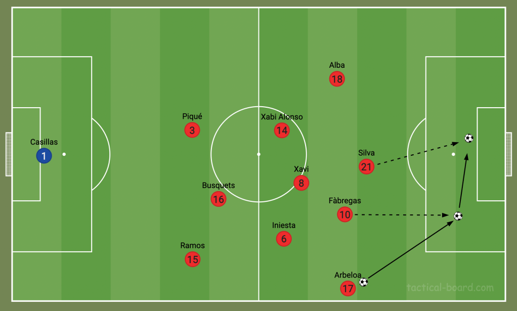 Xavi stayed higher, meaning even with a team of central midfielders, Spain could still exploit wide areas by shifting across and creating overloads. Having vacated the forward area completely, they relied heavily on third man runs in behind defences to get in on goal. Fàbregas was particularly proficient here, and David Silva too.
