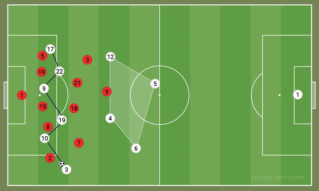 On each side of the pitch, England had three players whose movement relied on that of the other two. As seen below for example, the movement of a full-back inside would mean the winger would create the width by pulling wide, and the midfielder would then push up to the last line of defence.