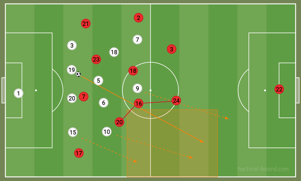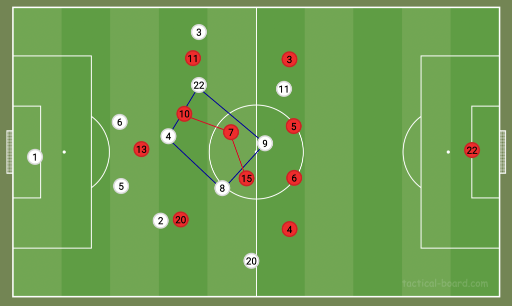 To make up for the absence of a No10, whose job it would be to play with their back to goal and receive the ball on the half-turn, Harry Kane dropped into this space between the lines as a false-9. This gave England a similar sort of threat, while still keeping three players in midfield to control the game. Against Wales’ midfield, it created a four-v-three overload.