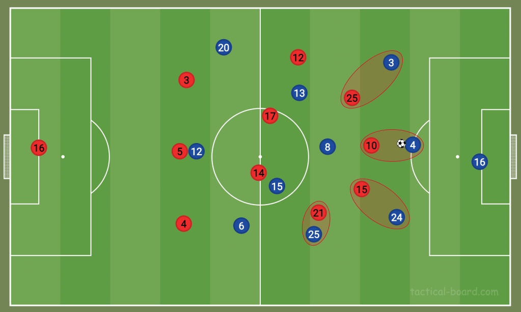 Tunisia’s famous 3-4-3 shape worked fantastically against the French shape, allowing the African side to press man-for-man from the back, with their forwards used to chase.