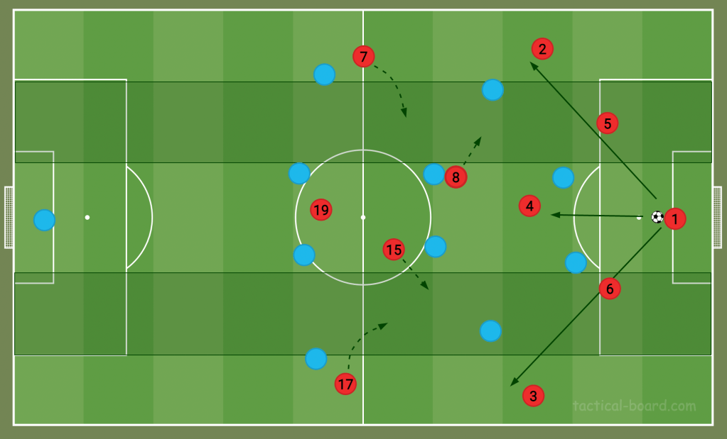 As seen below, in build-up, the half-spaces are almost completely vacant (barring the centre-backs). Opponents are attracted to the players and away from the half-spaces too. Since they want to play through Amrabat or the full-backs, Morocco’s wingers and wide midfielders often make late runs into the half-spaces, taking opposition players with them. This frees up the central zone and flanks so that Amrabat can get on the ball with many passing angles, and the full-backs can bomb on forward.