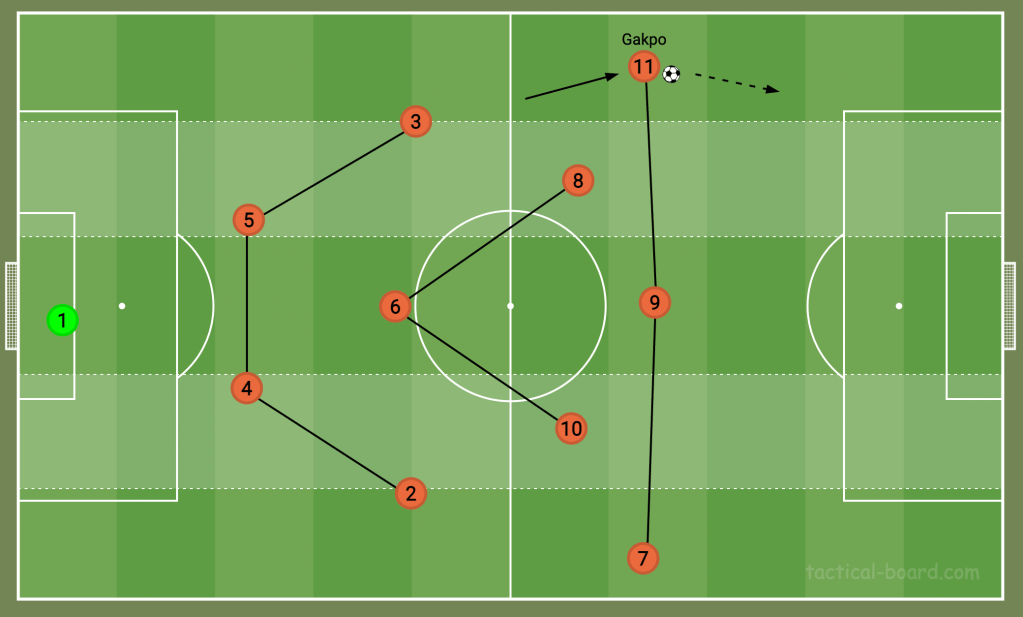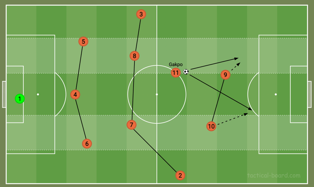 Here, Gakpo’s quick reaction time came into play, helping the team play on the counter-attack. His height and unlikely strength made him a good match for opposition holding midfielders who tend to dominate with aggression.