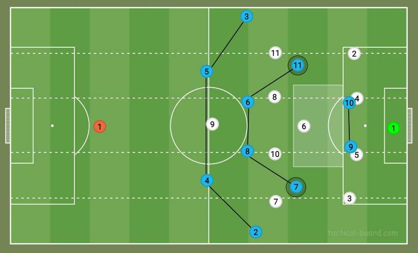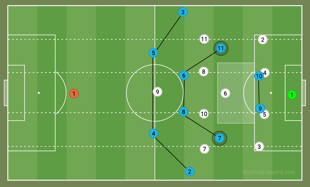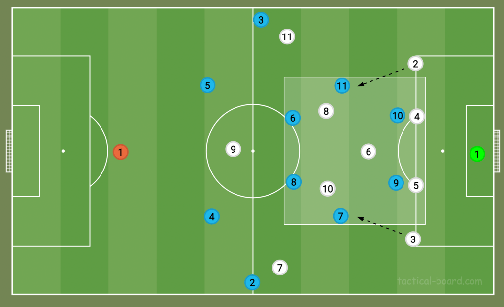 Having inverted wingers also means the attacking team is now in a six-v-five overload by default, and the defending team’s full-backs have no one to mark.