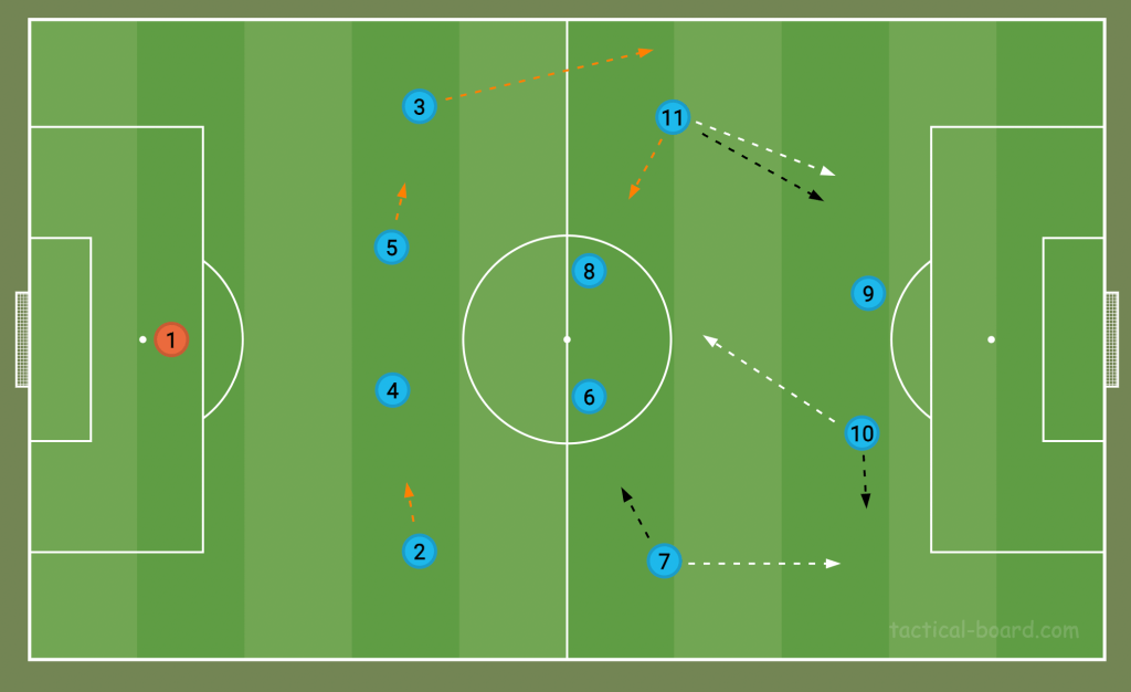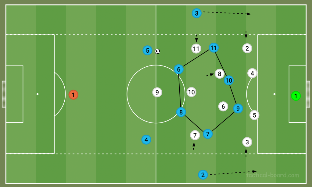 With overloads made so easily in central areas, defending teams tend to squeeze centrally in response, leaving the wide lanes free for full-backs to advance into. It’s worth noting that the full-backs must be very willing runners in this system, given its central focus.