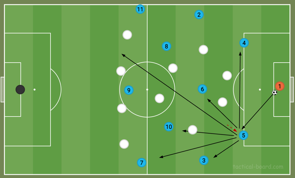 This alone would be impressive, but it’s made more so by the fact that Aké is left-footed which means, unlike most left-centre-backs, he can receive a pass on his front foot. For this reason, he plays forward passes more often, where some rack up an impressive pass completion rate through safe passes on their favoured right foot. Right-footed centre-backs who play on the left, such as Harry Maguire or Kalidou Koulibaly, have to take an awkward, backwards touch before playing a pass which automatically narrows their passing options.
