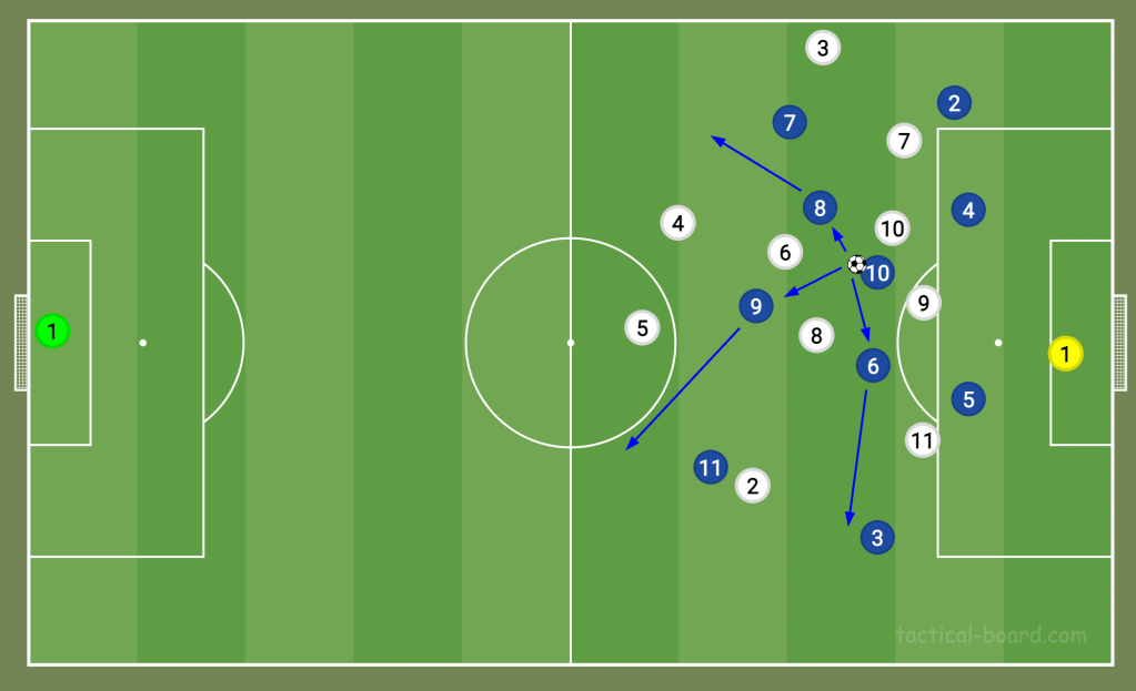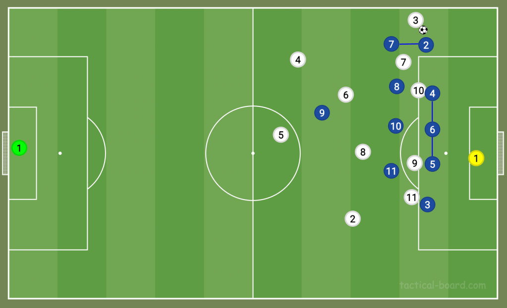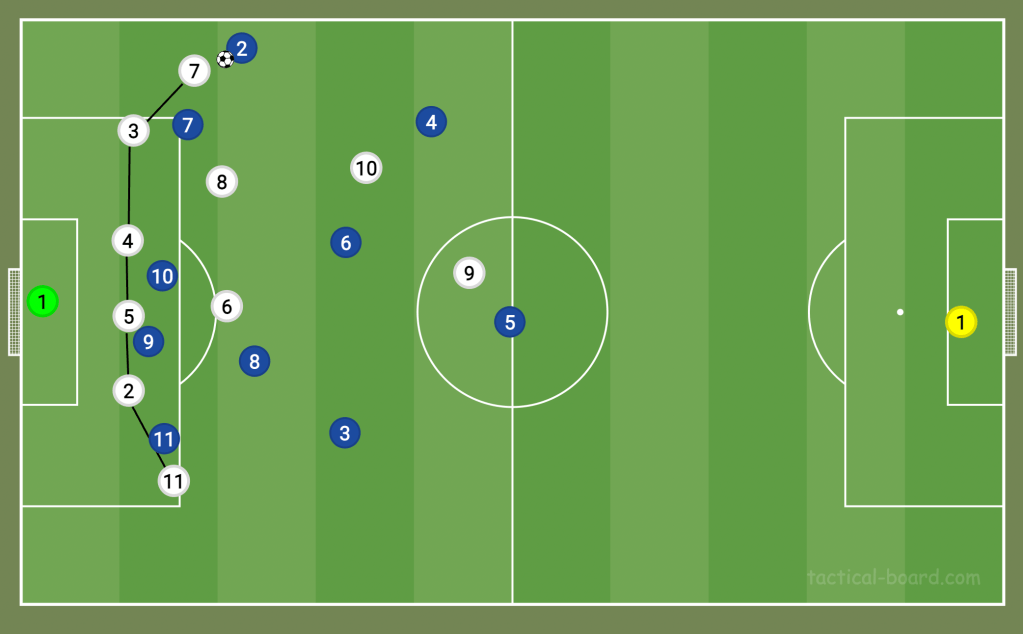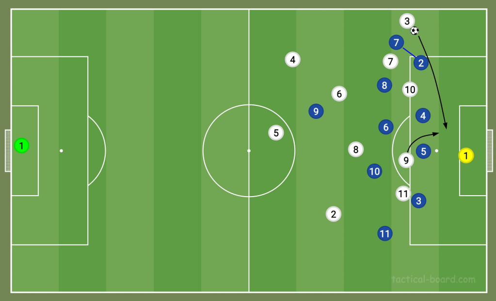 As mentioned above, this is similar to the way Fulham defend. However, they don’t always become a 4-5-1 in defence, with the No10 usually remaining higher than the rest of the midfield. This leaves a four-man midfield to cover the width of the pitch. For opposition teams playing a 4-3-3, they can get players in all five vertical zones on the pitch, and the half-spaces are often their best route into the box either with a deep cross (as seen below) or with an intricate bounce pass. That’s how to beat their low-block.