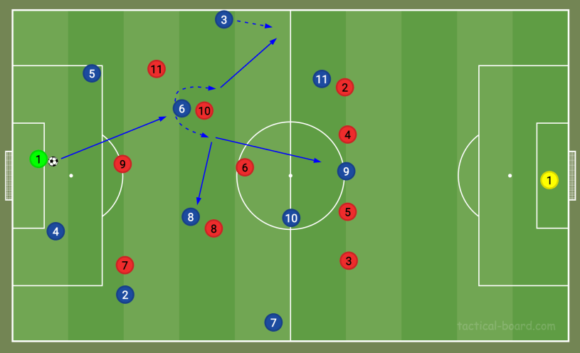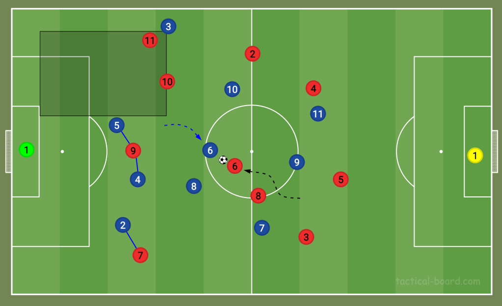 However, Fernández will know that the two centre-backs can take care of the No9 and that the right-back is tracking the No7. So blocking the obvious pass to the No10 won’t leave Chelsea exposed. He won’t just run towards the No10 to intercept the pass, though. He’s very good at curving his run when he blocks a pass. This way, he can both block the pass and press the ball carrier at the same time. If he gets close enough, he can make a tackle.