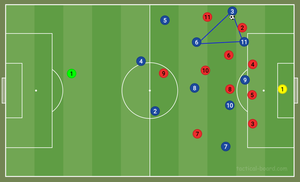 He is exceptional at reading the game and always staying one move ahead. The diagram below shows a typical counter-attack when Chelsea are running back to defend. There is a large gap in the left-back area. It’s simple for the opposition to play into the space and shoot with the No11.