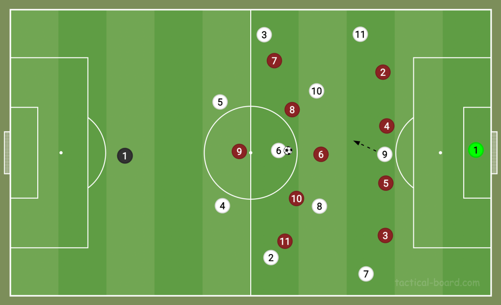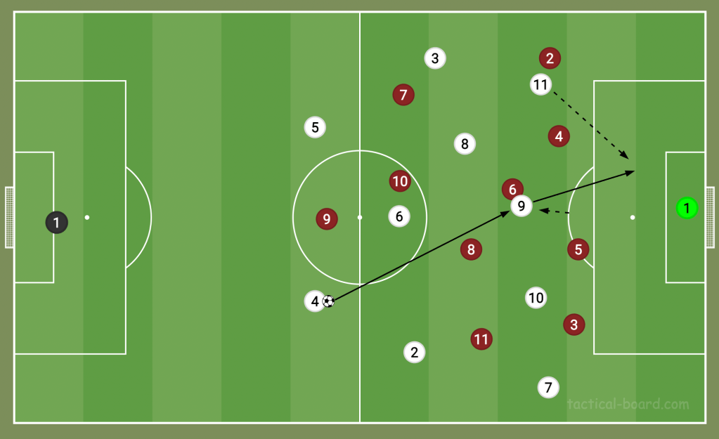 Manchester United are also enjoying the benefits of deploying a target man again, but this time it’s a bit different. Wout Weghorst, 6 ft 5, has been dropping deep into a No10 position to harness Manchester United’s threat in behind. Marcus Rashford makes diagonal runs from the deep left-wing into the box, and a target man like Weghorst can flick on a long ball with his head, allowing United to avoid playing slow build-up on the floor at times. United aren’t a possession team yet, so bypassing the midfield with long balls means they can create more chances than playing lots of short passes. However, this only works because they know Weghorst will be first to the ball.