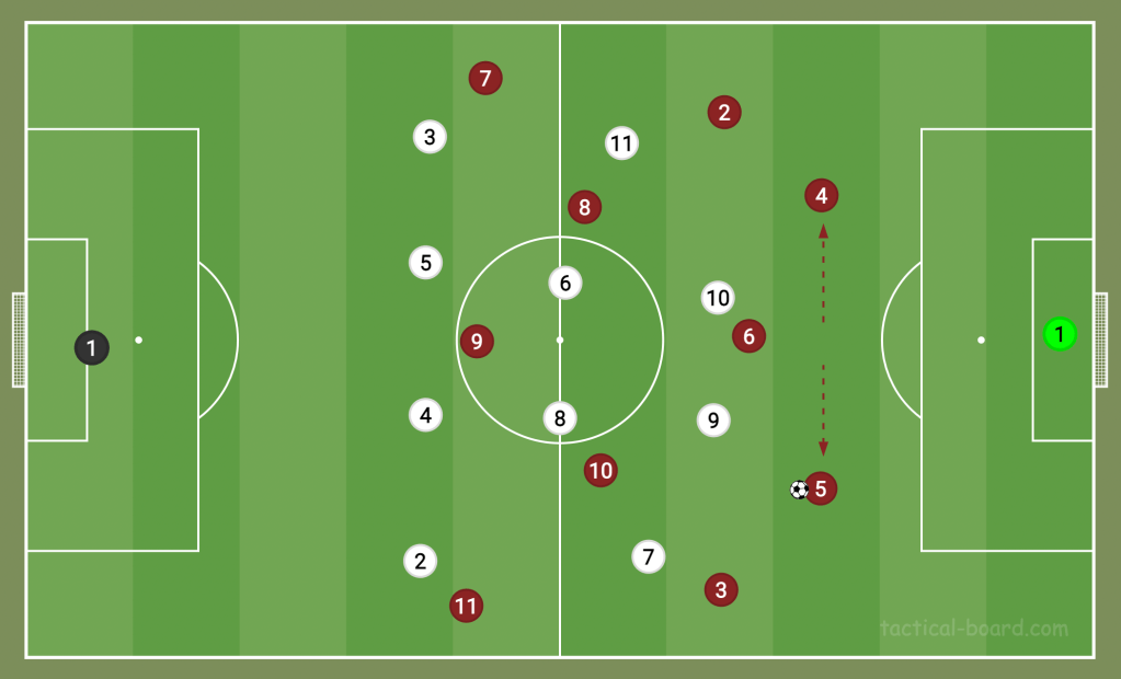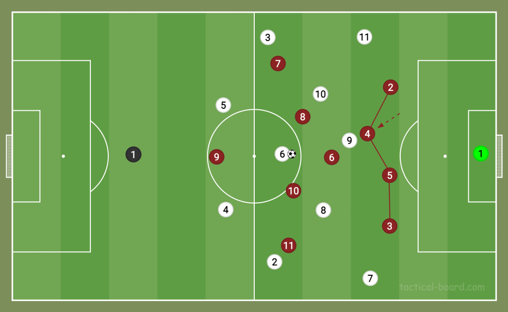 And with that, the profile of centre-backs has since changed. They no longer need to be the tallest, strongest players on the pitch. Centre-backs like Lisandro Martínez at Manchester United, David Alaba at Real Madrid, and Ajax’s Jurrien Timber are essential in the modern game because their skills lie in helping their teams on the ball. The lack of target men now means defenders don’t have to be tall or stocky, whereas ten years ago, they may have been forced to play as a full-back or midfielder. Centre-backs these days have to be proficient at stepping up and splitting wide, both in and out of possession (as seen below).