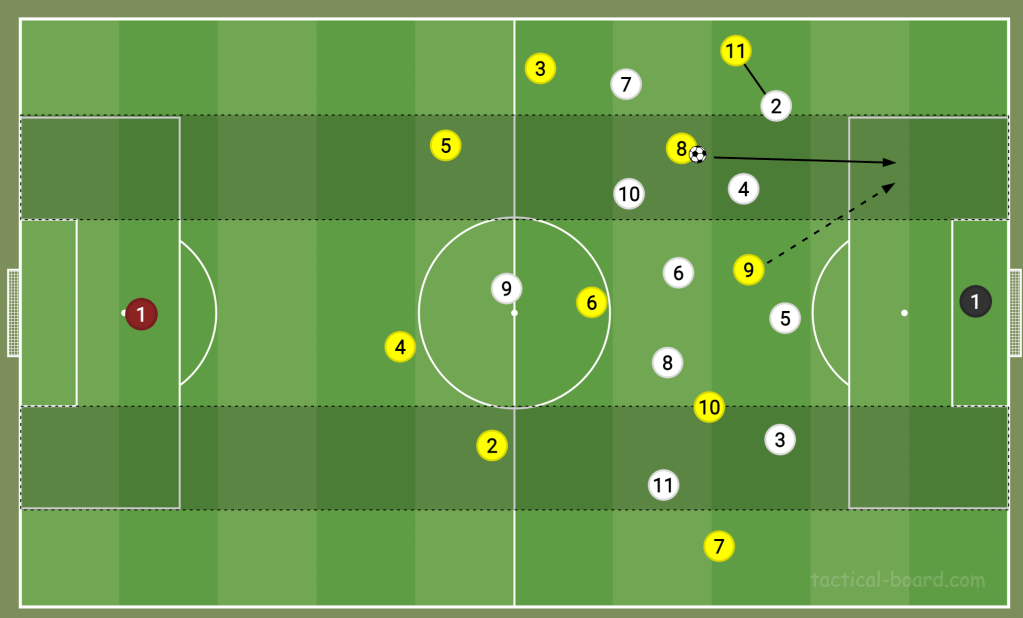 They’re hard to defend, which makes them very good for progressive passes. Often we see centre-backs playing a straight pass to an attacking midfielder, penetrating the opposition’s midfield line, as seen above.