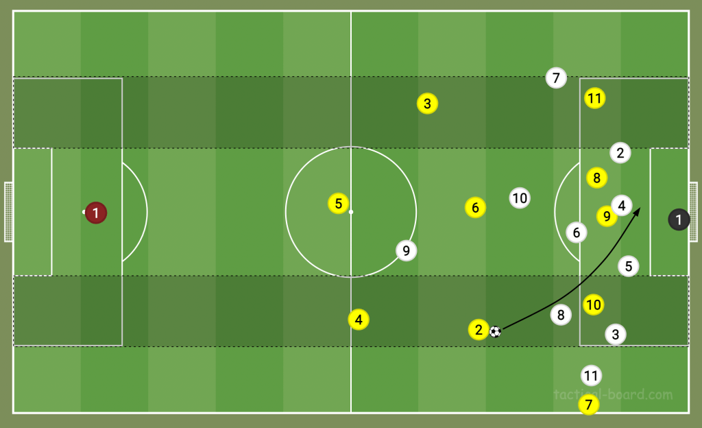 Another common use is when a winger threatens to put a cross into the box, and the opposition has a few players engaged in blocking it before it reaches the box. For support, the attacking team should always have a full-back or midfielder behind the ball in the half-space. A short pass back to this player opens up a new crossing angle (from deep) that the defending team are not set up to defend effectively.