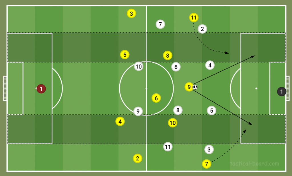 Once the attacking team is past the first line of pressure, different coaches prefer to use the half-spaces in different ways. Some like to get a playmaker on the ball in the half-space. This player can play a straight pass for a diagonal runner into the half-space. Alternatively, they could play a diagonal pass for a straight run either out wide or in the centre.