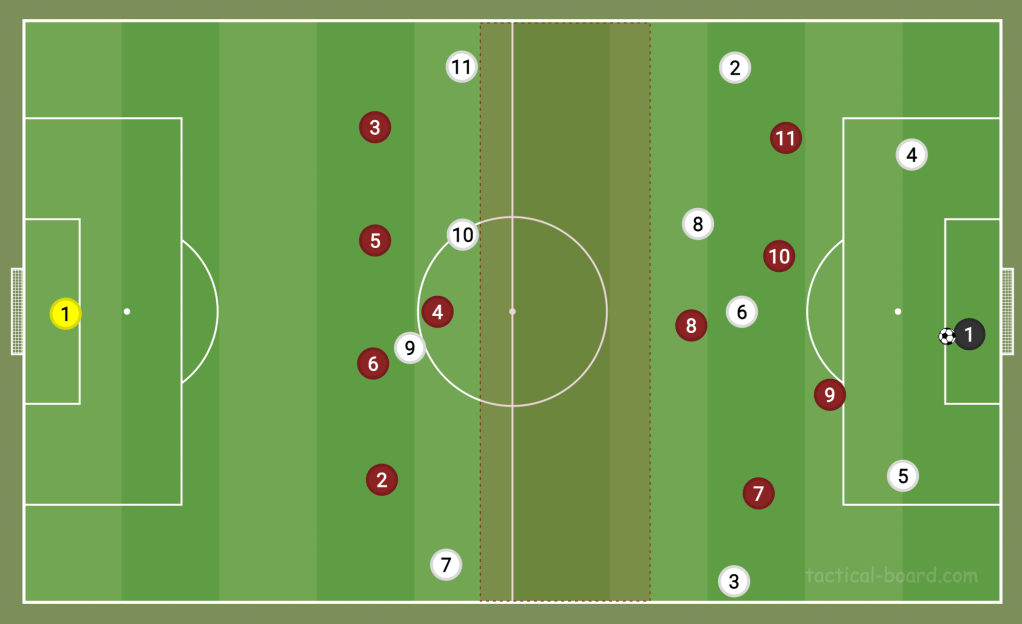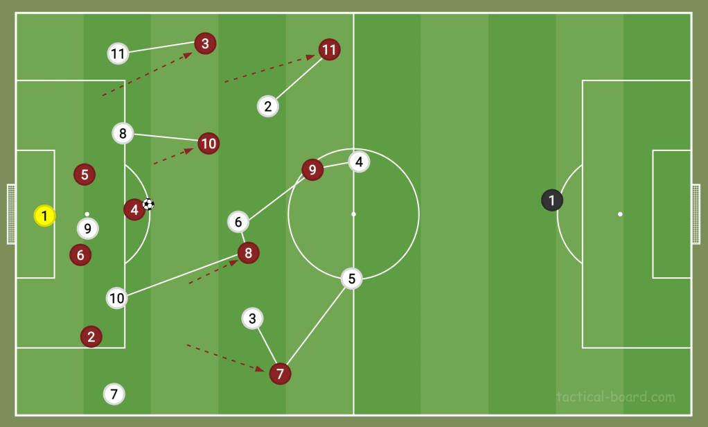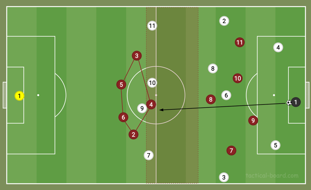 One example of a long ball trap could be to leave a large gap between the front-five and back-five during an initial press. The front-five would do enough to deter a slow build-up from the opposition, while the space between West Ham’s defence and attack would encourage other teams to play a long ball into this area.