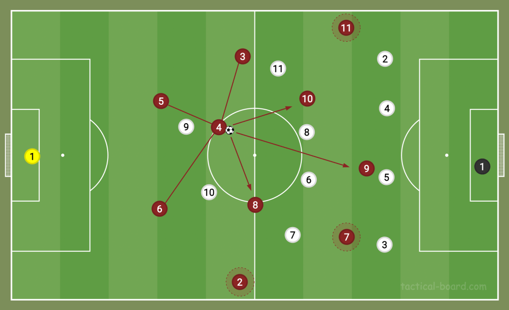 While his performances have dropped along with the rest of his teammates this year, Rice is now comfortably one of the five to ten best holding midfielders on the planet. His strengths lie in ball-winning, screening the defence, making driving runs with the ball, and providing pinpoint passing. The key to harnessing his ability is to give him as many passing angles as possible. Having teammates at different distances across the pitch means he can access all areas. The image below shows how he should always have support behind him, a couple of far outlets, and at least three close passing options.