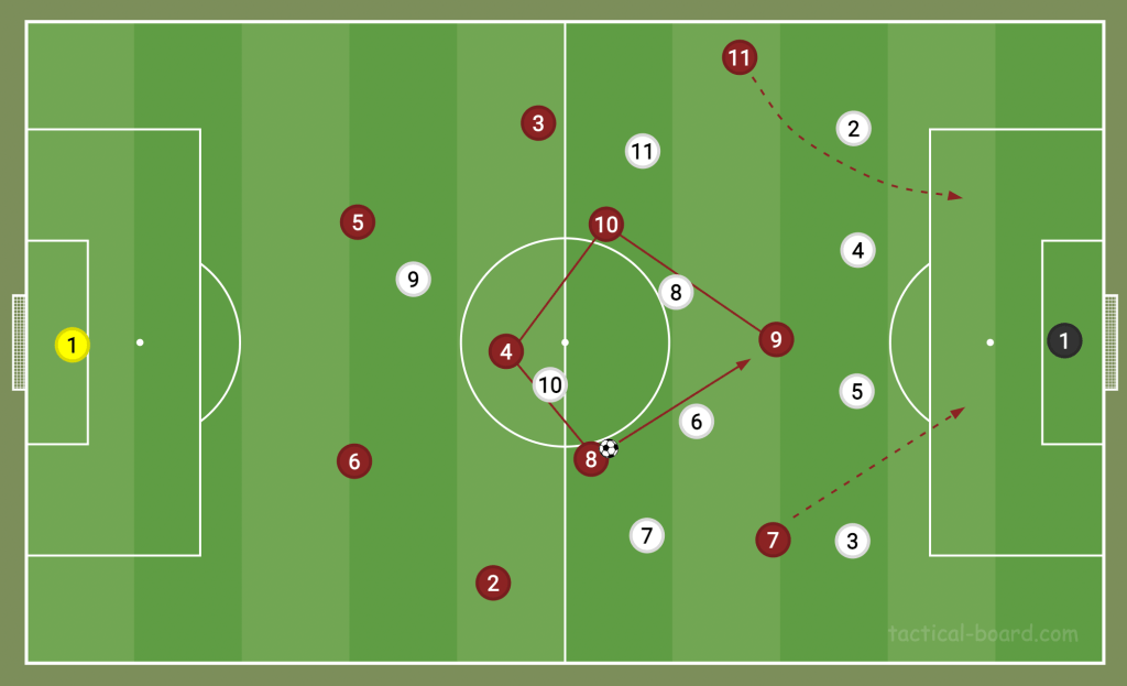 Danny Ings and Michael Antonio have been effective at pinning defences, while the wingers drop in to assist with the progression of play. However, the occasional run into the false-9 pocket could help West Ham utilise the skills of their strikers and wingers. Ings could drop in, creating a four-man midfield, while the wingers use this as a trigger to make diagonal runs in behind. It would make them less predictable and prevent the Hammers from needing a No10 to play with their back to goal.