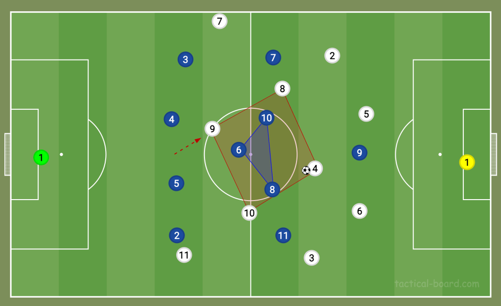 When England went down to ten men, instead of taking off a central player and making a 4-4-1 formation, Southgate took off a winger, which left England in a 5-3-1 shape. The reasoning behind this was to maintain a three-v-three battle in midfield. Had England gone to a 4-4-1, they’d no longer have been able to go man-to-man with Italy.
