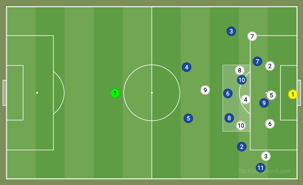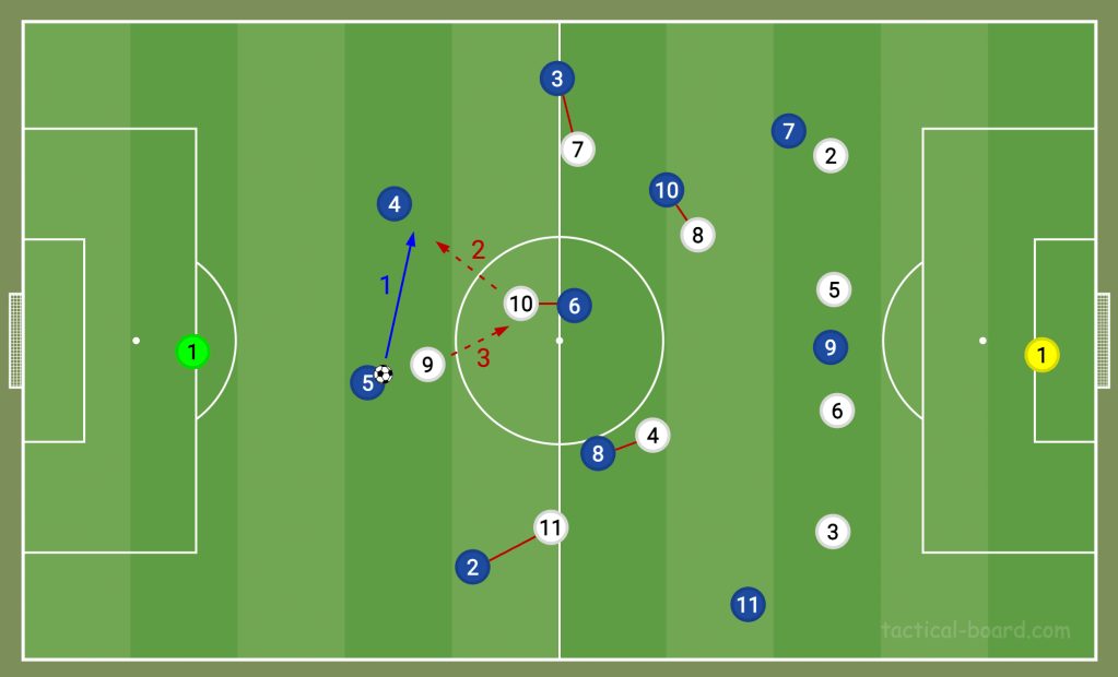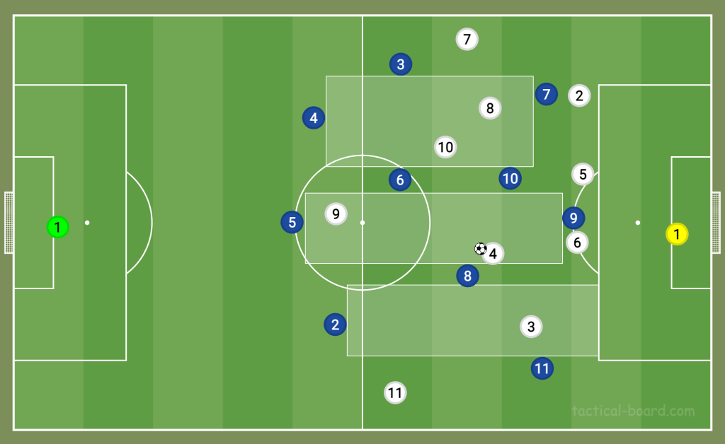 Of course, this is a brave tactic, and it’s how Italy scored their only goal of the night. (Maguire stepped out and left a hole in the England defence. Nicolò Barella flicked the ball round the corner to a teammate, and Italy suddenly had a positional advantage.). However, for the most part, England’s man-to-man marking of Italy’s midfield meant the blues had no outlet, so they couldn’t benefit from Maguire and co stepping out of shape.