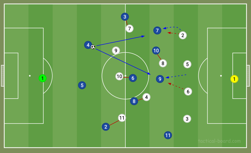 Secondly, Italy’s defensive transition was not at all polished, and England took advantage of the gaps left in their shape. Upon losing the ball in the final third, Italy often found themselves badly staggered, with three vertical channels cutting through their entire team. Rice, so often the ball carrier starting the attacks from central, could maraud forward and find his teammates unmarked in the half-spaces as Italy scrambled to get back.