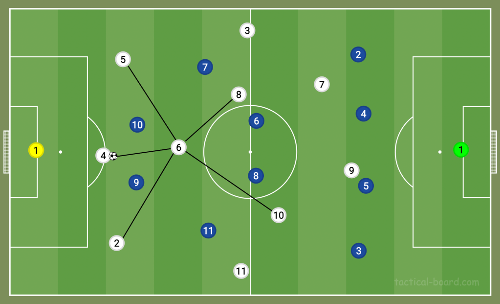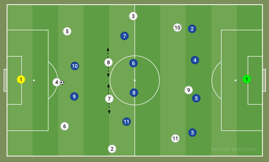 Since Tottenham aren’t a possession team and tend to sit off, they’ll usually look to counter when they get the ball. They’re a team that don’t want long spells of possession, circulating the ball from left to right. They’ve recently lost this quick spark, and their counter attacks have become less frequent and dangerous. Even so, at their best, they aren’t set up to have the ball. This is as much a personnel issue as a qualm over their formation. The 3-4-3 Antonio Conte built his team around had very minimal staggering. His wingers were traditional wingers; his centre-backs all played in back-fours prior. His centre-midfielders were neither defensive nor attacking. There were three very separate lines; no one between the lines.