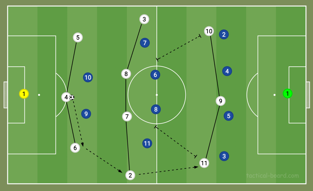 At RB Leipzig, we saw this player often take the lead in a 4-3-3 shape, while at Bayern, he played Joshua Kimmich in front of a back-three during build-up, with many options ahead drawing the opposition back to give him time. The more time Kimmich had on the ball, and the more passing options, the Bayern would be — or so Nagelsmann believed.