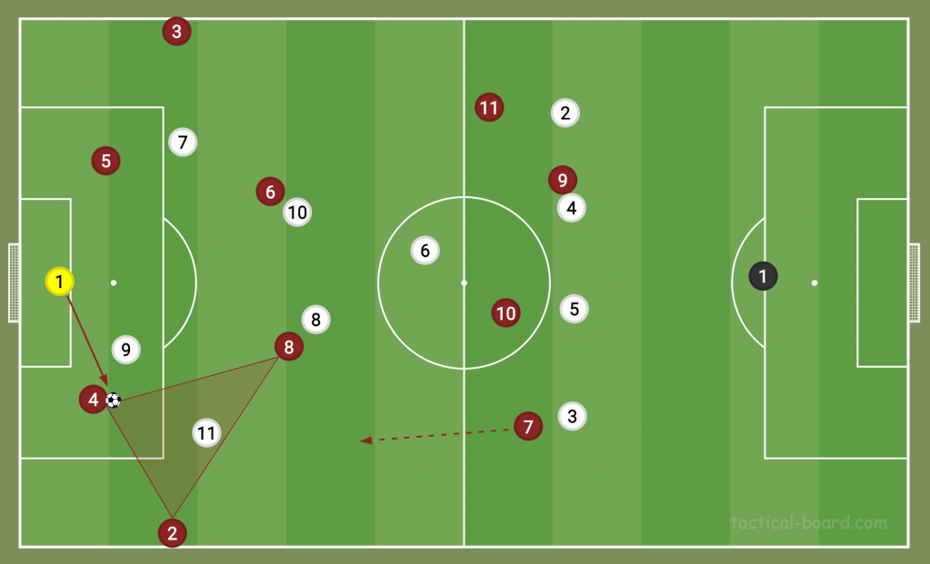 If the full-back holds his shape, the narrow positioning of the wide No.10 creates a desirable midfield box from which Villa can control the centre of the field. If the full-back tracks the run, this opens space for the near-side forward to run in behind. They’ll often notice this and play the ball straight to the full-back to make this long pass easier.
