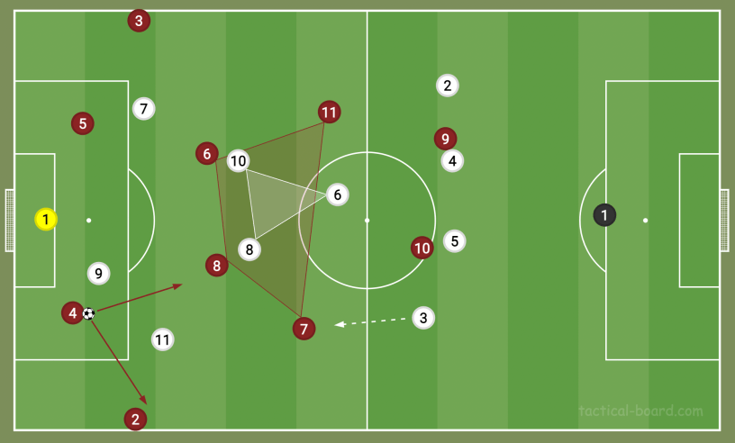 Starting from the goalkeeper, the back-four stay deep and spread wide. The two No.6s in their double-pivot are crucial to build-up, staying in close proximity at all times. This makes it hard for pressing teams to block all attacking avenues.