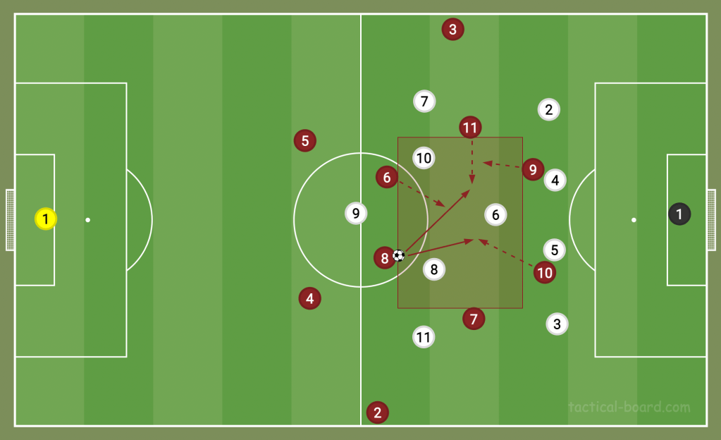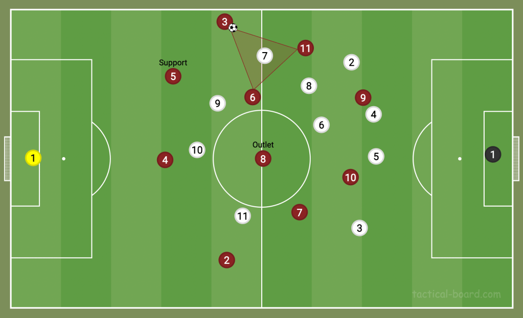 If this pass isn’t on, they like to try and find the far-side No.6, who’s usually well-positioned as an outlet and often neglected as a potential threat by the opposition.