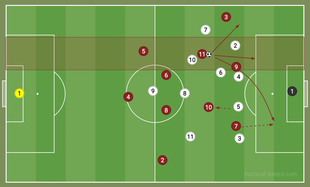 The far-side wide No.10 has become more of a winger in recent months because Emery’s opted to keep the far-side full-back back, forming a back-three rest defence when they’re attacking, since this gives them better security against counter-attacks. With the full-back deep and narrow, the onus has been on the wide No.10 to create natural width and stretch play.