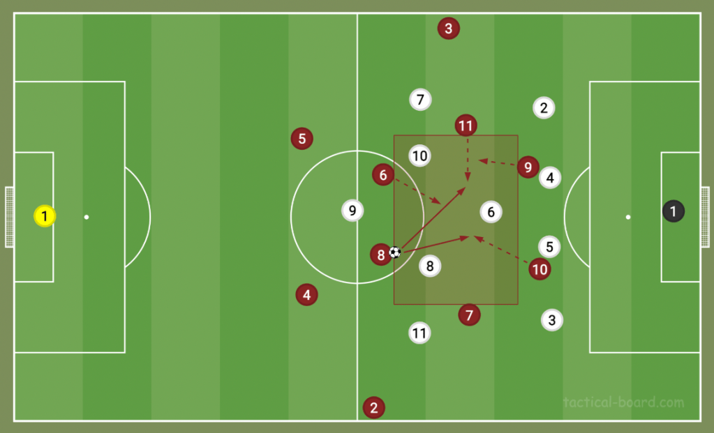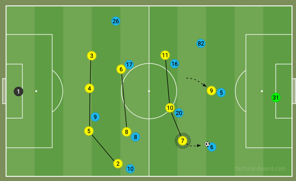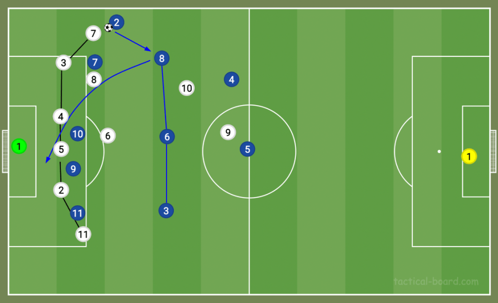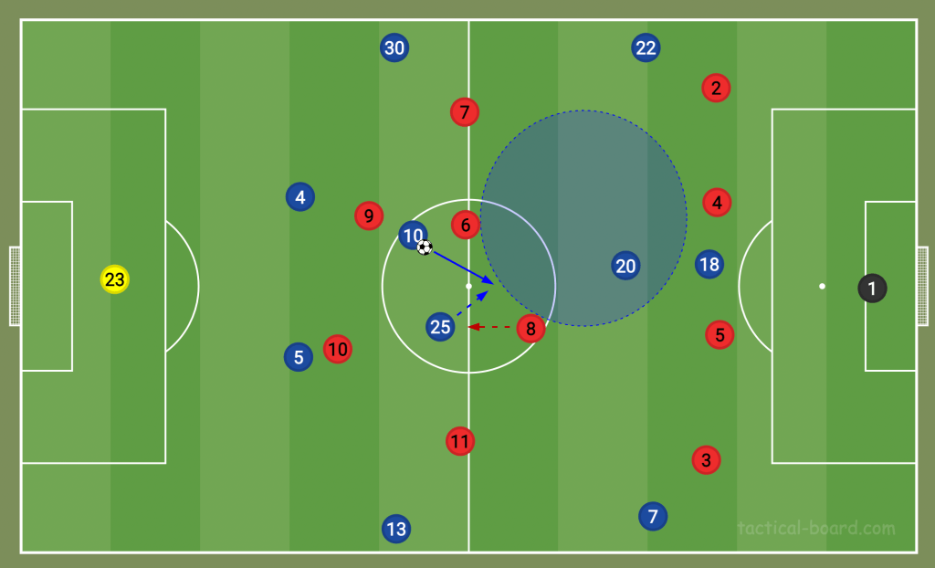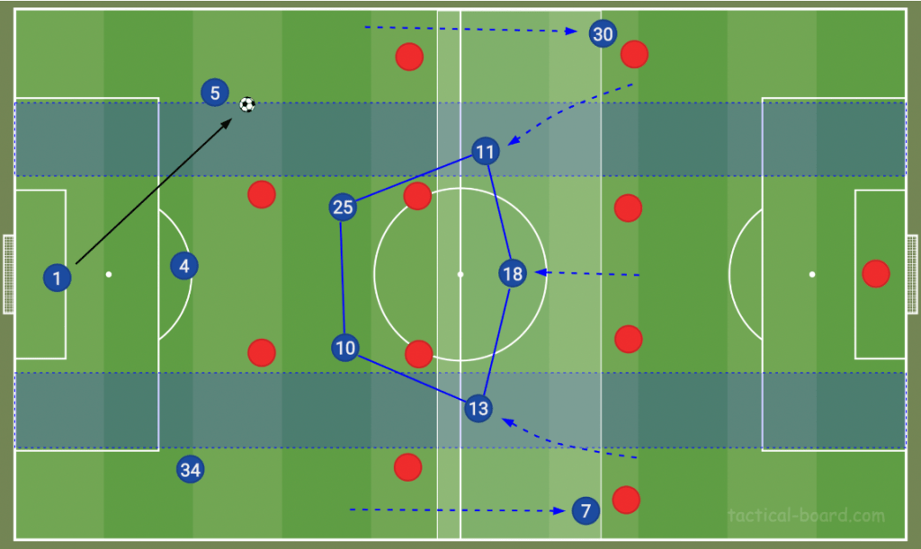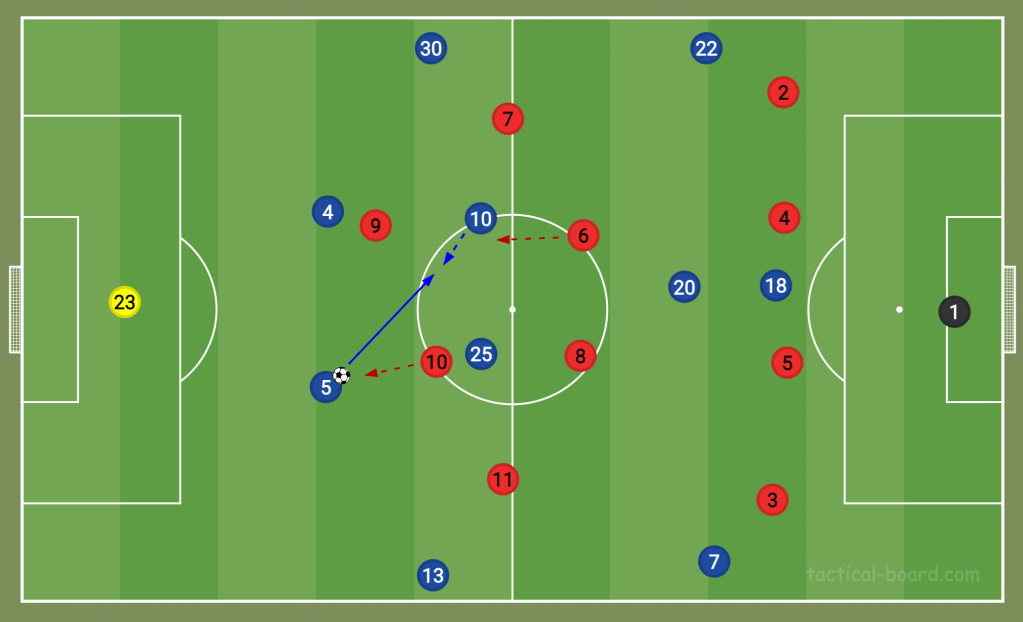 The centre-backs and double-pivot make a very compact square in possession. The centre-back will place his foot on the ball, baiting a press from the opposition striker. He’ll knock it to the other centre-back. At this point, they’ve taken a man out of the game, so the opposition frantically try to recover. However, they just fall into the trap of reacting late with a one-man press.