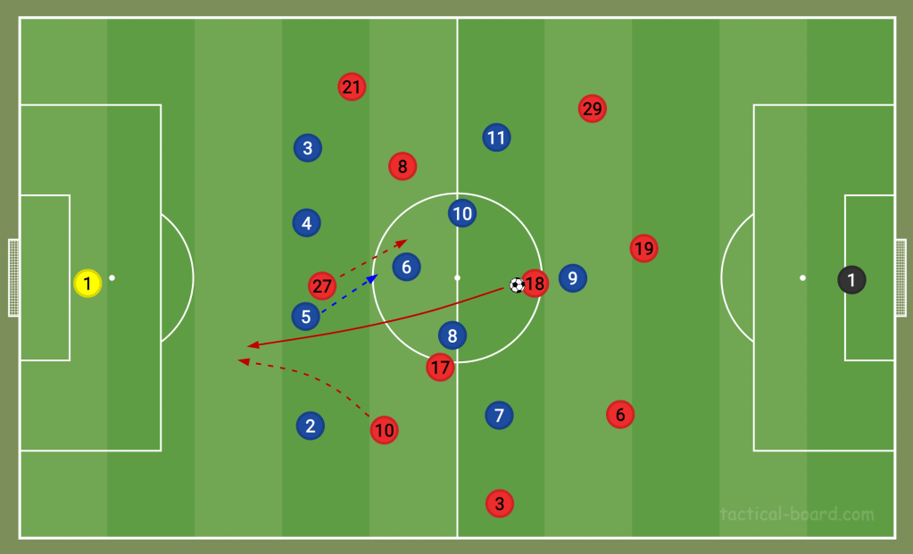 The other striker will press the centre-back, at which point they’ll under-hit a diagonal pass to the pivot whose marker left them.