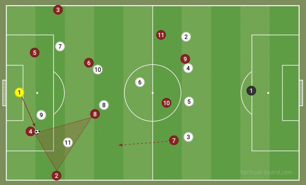 In build-up, Villa use seven players, which no team can ever match (due to the numerical advantage given by the goalkeeper). The double-pivot stays very close, and wide triangles help them progress up the pitch with wide channel balls.