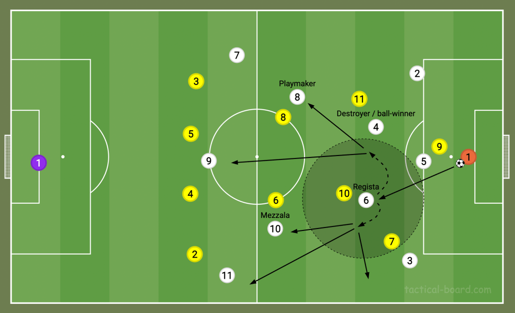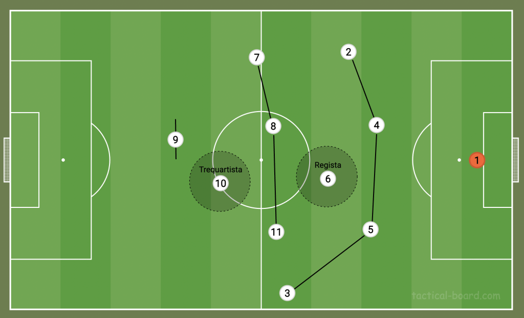 In most countries, the ‘playmaker’ has always been the No.10, the attacking midfielder. In Argentina, for example, they call this player the enganche, and he sits in the hole just behind the striker. However, in Italy, as Jonathan Wilson explained in Inverting the Pyramid, they split playmakers into trequartistas — No.10s who operate high up — and registas — deep-lying playmakers like Andrea Pirlo or Jorginho who sit in front of the defence.