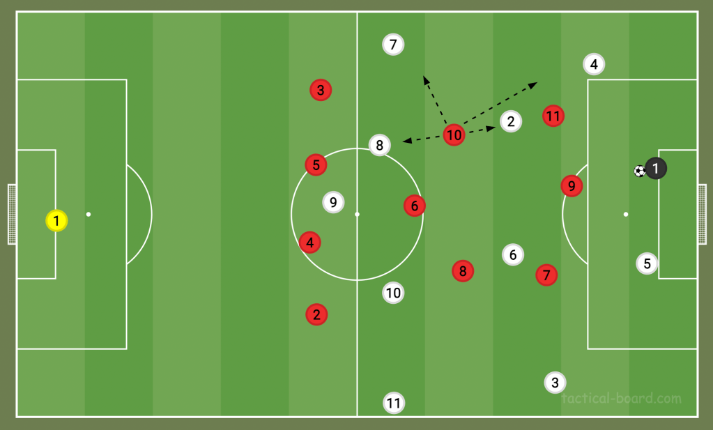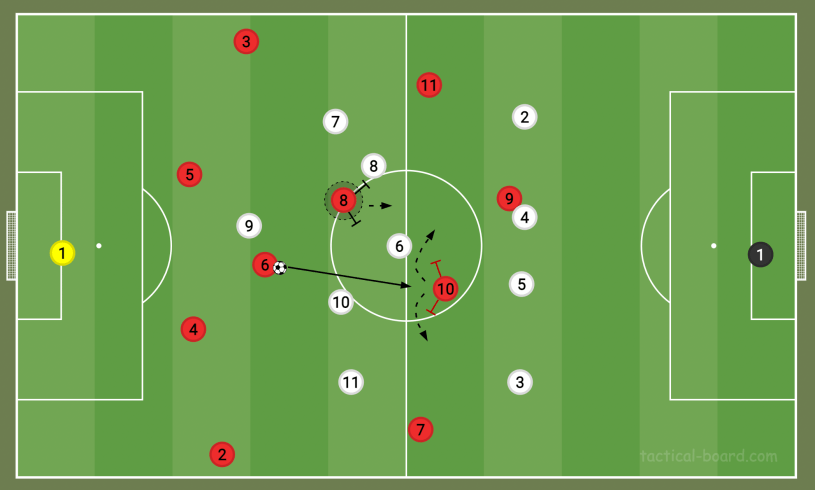 United’s pressing plan became more apparent towards the end of the season, and Mount would offer multiple options. He’s been known to join a front line in a 4-2-4 press (aggressive or passive) and, under Graham Potter, was often deployed in a midfield-three during a narrow 4-3-3 press.